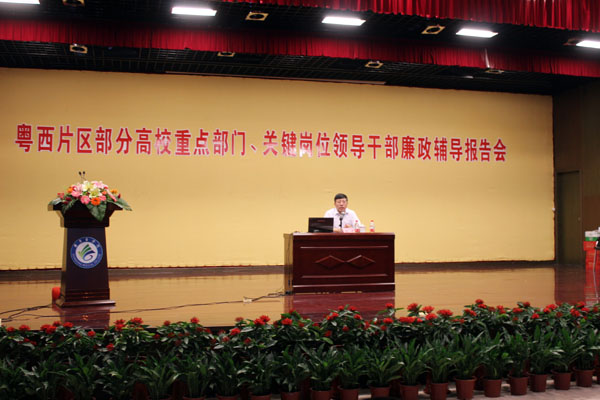 湛师新闻网10月19日讯 昨日,广东省教育纪工委在广东医学院湛江校区召开粤西片区部分高校重点部门、关键岗位领导干部廉政辅导报告会。来自珠海、佛山、中山、江门、肇庆、阳江、茂名、湛江等地17所高校人、财、物管理和招生、考试就业管理等部门主要负责人和广东医学院党政领导以及学生代表等500多人参加了报告会。我校组织了监察处、审计处、组织部、人事处、财务处、基建处、资产管理处、后勤产业处、招生就业处、招投标采购中心主任、饮食中心总经理等重点部门干部12人参加了报告会。
