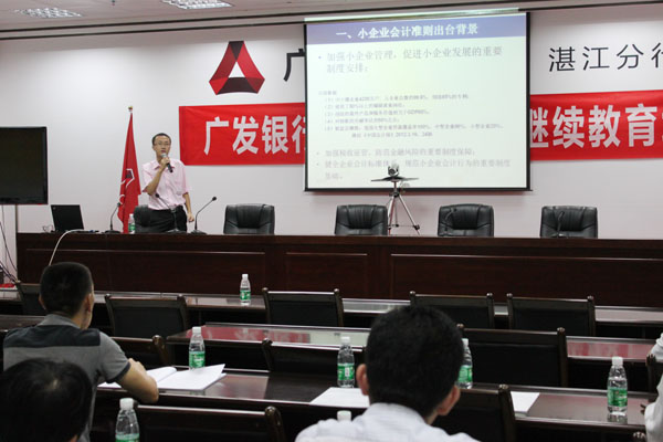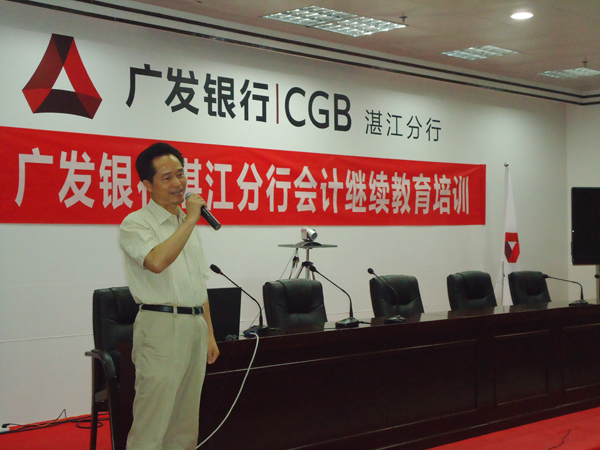 广发银行湛江分行2012年度培训人数为183人,由我校继续教育学院承办,开班典礼由广发银行湛江分行计划财务部刘澎总经理主持,我校继续教育学院黄树彬主任科员代表培训承办学校作了发言,专题讲座由我校商学院会计学专任教师黄电老师讲授。