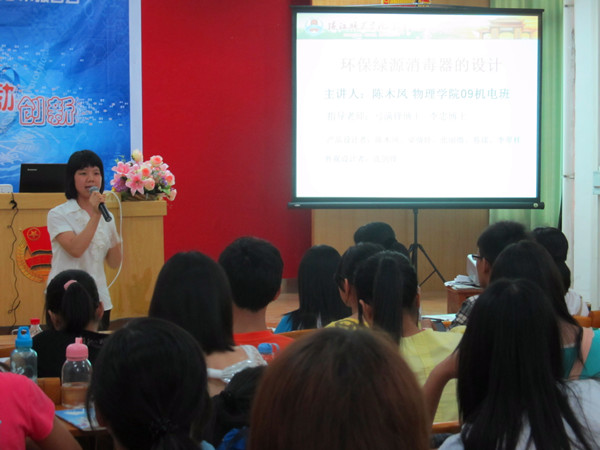 湛师新闻网10月17日讯 为了贯彻“弘扬学术,激励创新”的思想,10月14日早,来自物理学院09机电的陈木凤同学在鸿园四楼学术报告厅做《关于环保绿源消毒器的设计过程》的讲座。