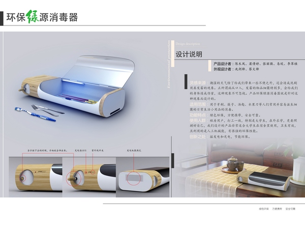 陈木凤介绍道,环保绿源消毒器的设计理念主要源于拟实现一种环保节能、便于携带、操作简单、功能丰富以及外观新颖的消毒产品,以解决外出吃饭、旅游时的卫生问题。据了解,环保绿源消毒器以紫外线灯管作为消毒原件,产品适用于如:牙刷、筷子、汤匙、水果刀等人们常用并容易滋生细菌的日常生活小用品的消毒除菌。她介绍说,环保绿源消毒器与普通消毒工具最大的不同之处在于环保绿源消毒器不但外观新颖轻巧,而且可以手摇充放电、设有车载插头,随时可以充电。此外,环保绿源消毒器具备定时消毒功能,标准时间为8分钟。