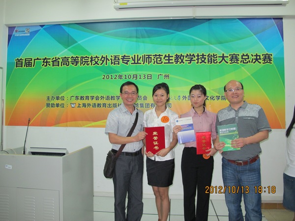 据悉,总决赛大专组共有来自全省14所高职高专院校的23名选手参赛。湛师基础教育学院共选派两名选手参赛,其中柯司苹同学在感冒未愈的情况下,却能在比赛中沉着迎战,发挥稳定,凭借出色的教学设计,娴熟的教学技能,流利的英语口语和精美、有效的课件,最终以总分91.8分第一名的优异成绩获得广东省首届外语专业师范技能大赛的冠军。另外一名选手林宝华同学也凭出色表现荣获二等奖。
