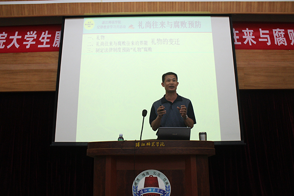 湛师新闻网10月13日讯 为认真落实《湛江师范学院2012年纪律教育学习月活动实施意见》,进一步加强广大师生党员的纪律教育学习。 10月11日晚,由纪委、通识教育中心、思政部携手在图书馆学术报告厅,开设了大学生廉洁修身学术报告——《礼尚往来与腐败预防》,思政部林兴副教授主讲。思政部主任何增光教授、通识教育中心林春主任出席了报告会,报告厅内座无虚席,学生们认真聆听了林兴副教授的精彩报告。报告会由通识教育中心林春主任主持。