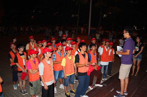 晚会还没开始,志愿者们便穿戴整齐鲜红的志愿者服和红帽子,早早地等候在图书馆门前。校青联副主席王志平也亲临现场,耐心地为每组志愿者分配任务。任务主要包括三部分,分别是维护台下现场秩序、保管表演者财物和搬运表演器材。