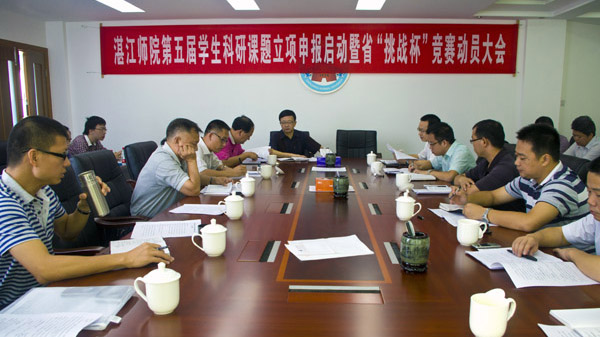湛师新闻网9月24日讯 为引导和激励全校学生勇于创新,并提前做好明年省第十二届“挑战杯”竞赛工作,9月17日,我校在学校二号会议室召开了第五届学生科研课题立项申报启动暨省“挑战杯”竞赛动员大会。学校李江凌副院长,教务处程可拉处长,科研处金义富处长、校团委郭和才书记、李亚九副书记和各二级学院党委副书记及分管科研工作的院(副院)长参加了本次会议。