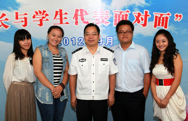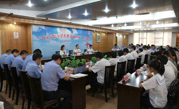 湛师新闻网9月20日讯 9月17日,在湛江市公安局举办的“公安局局长与学生代表面对面”座谈会上。湛江市常务副市长、市公安局局长张荣辉,市公安局党委委员、政治处主任蔡亚福,市治安支队、禁毒支队、网警支队等相关职能部门的领导干部,与我校学生会主席梁仍扬、青联会主席秦光镁、校团委副秘书长何文静和黄莉等同学,以及来自我市各高校与中学的19名学生代表,一起座谈探讨共商破解社会难题。