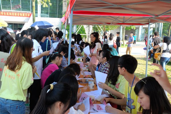 湛师新闻网9月19日讯 激情九月,青春涌动。9月15日上午,由我校四个学生机构主办的公开招聘校级学生干部咨询会在雷阳区体育馆前举行,现场接受咨询并发放报名表。校团委郭和才书记,李亚九副书记等领导老师以及校四个机构的全体学生干部参加了此次活动。新生们早早就过来“抢”报名表,现场热闹非凡。