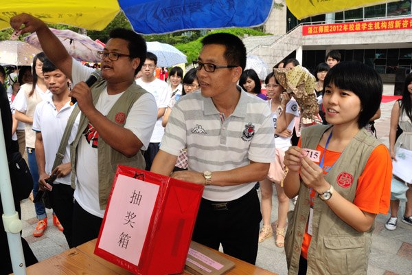 咨询现场不仅有车水马龙的咨询和报名队伍,而且舞台上有悦耳的歌唱声、精彩的小品、优美的舞姿,吸引了众多学生前来观看。最吸引人眼球的当数学生会的报名抽奖活动。活动中,郭和才书记、李亚九副书记还现场为报名的同学抽奖,现场一度进入了紧张的气氛中,30个幸运号码被抽出。随后,郭书记和李副书记现场为中奖同学颁奖。