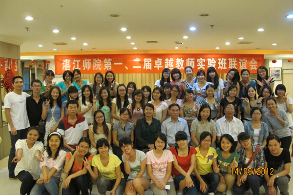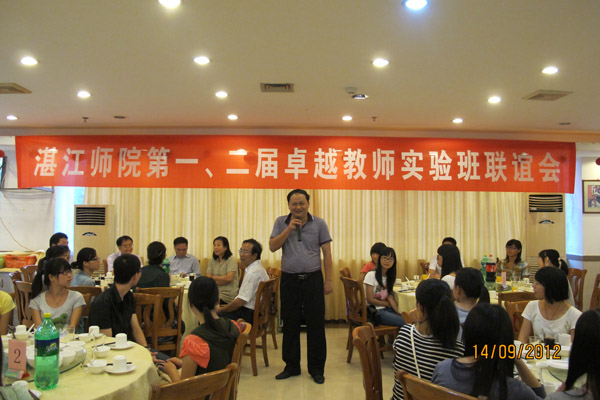 湛师新闻网9月17日讯 13日下午,我校在园府酒店二楼举行了第一、二届卓越教师实验班联谊会。教务处处长程可拉教授、我校附属中学梁哲书记、外语院陈俊英教授、李方特聘教授、教科院曾茂林副教授、教育研究院左兵副院长,华南师范大学硕士研究生施八一、劳诗玲、李小华、陈彬以及第一、二届卓越教师实验班全体学生参加了本次联谊会。