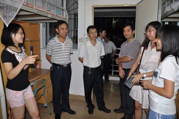 外语院的曹志希院长、党委孙卫东书记、冯彩莲副书记、辅导员陈理才、冼柳艳、杨进军、罗成燕老师走访了新生宿舍。领导、老师们先后到弘志苑、尚志苑走访了该院2012级男、女生宿舍。了解新生们的宿舍入住情况后,领导、老师们强调,新生们要注意人身安全和财产安全:刚到学校不要乱走、乱外出;贵重钱财保管好、别随身携带太多现金;防止推销、传销和手机诈骗;遇反常情况及时与领导、老师联系等。
