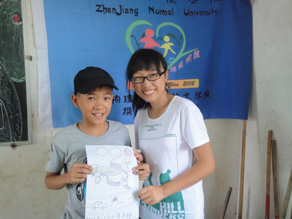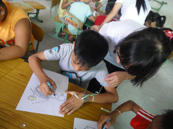 “携爱同程”实践队以“关爱留守儿童,共享一片蓝天”为主旨,在湛江市吴川兰石镇准备举办为期12天的实践活动,让留守儿童可以得到关爱,健康幸福地成长。在队员来到基地的第二天,开始了首次的趣味课堂。在课堂上,主要以小游戏的形式开展,避开了枯燥的课堂,最大限度地调动学生的积极性,将队员与孩子们的距离拉进。在趣味课堂上,首先让孩子猜谜语,让学生熟悉不一样的课堂。然后让孩子们画出自己心目中的家,在作画过程中,介绍绘画的知识,顺便了解每个孩子的基本家庭情况,让接下里的工作更容易开展。