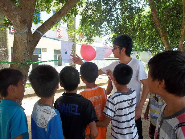 首先,队员们把学生的作品用绳子挂起来,一张一张展示出来,课堂铃声一响,学生们兴奋的跑出来,争先恐后地寻找自己的作品,当他们找到自己的作品时,自豪地指给同学和队员看,其中,有一个学生还向队员介绍说,“老师,这幅画是告诉我们小朋友不能在河边游泳。”在一旁的队员一边引领学生有序地参观图画和书法,一边根据作品的内涵向学生宣传安全知识,以增强他们防雷电、防溺水、防火等安全意识。