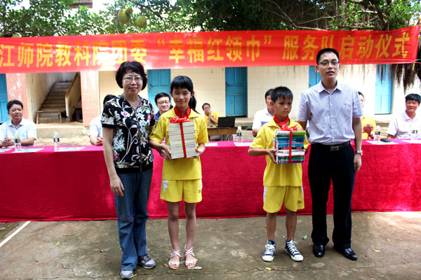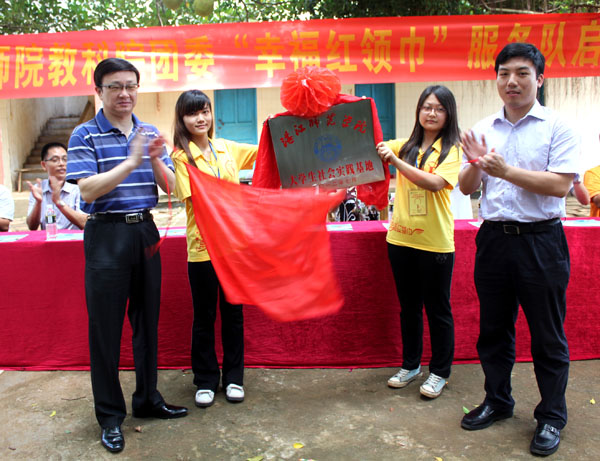 在雷州市乌石镇潭板小学,李江凌副院长一行参加了我校教科院团委“幸福红领巾”服务队的启动仪式暨我校乌石镇潭板小学社会实践基地的揭牌仪式。仪式上,我校李江凌副校长与乌石镇谭超镇长同为实践基地揭牌,校党委组织部邓妍妍部长和校团委郭和才书记代表我校向潭板小学捐赠价值3000多元的图书。潭板小学麦华渊校长在致欢迎词中表达了对我校领导老师和学子们到来的感激之情,并表示,将提供各种便利,帮助我校实践队克服各种困难,收获一个充实而有意义的暑期社会实践活动。教科院团委邓倩文书记在仪式上表达了对潭板小学能为我校提供社会实践的感谢之情,同时鼓励我校学子积极投身社会实践,在实践中锻炼自我,增长才干。