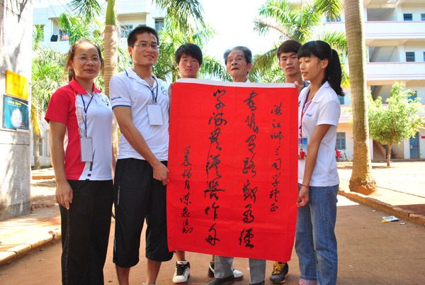 今年旧地新人,陈老不顾行动不便依然前来观望问候,并现场挥毫,用他刚劲有力的草书书写了“书山有路勤为径,学海无涯苦作舟”的对联,赠与“向阳”服务实践队。