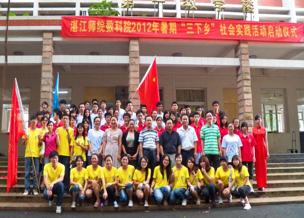 湛师新闻网7月7日讯 昨日下午,数科院于古榕广场举行了以“幸福广东·青春奉献”为主题的2012年“三下乡”社会实践启动仪式。数科院党委李健彬书记、院长李晓培教授、党委唐洪浪副书记,辅导员黄展老师、全光华老师、卜秋香老师、杨洁老师,及“三下乡”队员代表参加了启动仪式。仪式由杨洁老师主持。