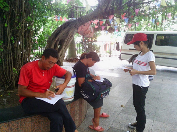 到达目的地后,两个人或三个人为一小组分开工作。看着匆匆的行人,有些队员感到很无奈,有些队员觉得是挑战。有些队员进入商店进行访问,却遭到店主或服务员的拒绝,可队员们仍是以微笑告别。有些坐在大树下休息的市民热情地接受他们了的访问并做了份调查问卷。对于这些热情的市民,队员们非常感谢。可是市民只是说,这是我们市民的义务,我们也想拥有一个更美丽的湛江。希望湛江变得更美更漂亮,不仅大人们这样想,连小孩也是这样想的。在调查过程,有人访问了一些读小学的学生,他们同样是希望湛江可以变得更干净,并认真地完成调查问卷。看着如此认真做调查的小学生,队员的脸上露出开心的笑脸。
