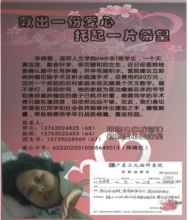 湛师新闻网7月6日讯 6月25日,我校人文学院09中本1班李晓蓉同学经医院检查确认脑中长有脑瘤,并伴有脑积水迹象。病魔与巨大的医疗费用不但深深地折磨着这个风华正茂的少女,还折磨着一个贫困的农民家庭。