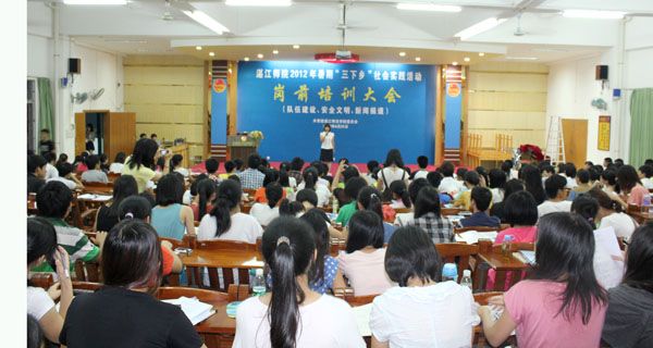 湛师新闻网6月26日讯 昨晚,我校团委实践部在弘雷楼311室举行了2012年暑期“三下乡”社会实践活动岗前培训大会,参加此次培训大会的有校团委李亚九主任、梁剑老师,“三下乡”经验交流代表夏雨哲、吴卓锦、梁艳同学,各二级学院暑期“三下乡”社会实践队的代表及部分社团实践队的代表。会场气氛热烈,洋溢着浓浓的青春气息。