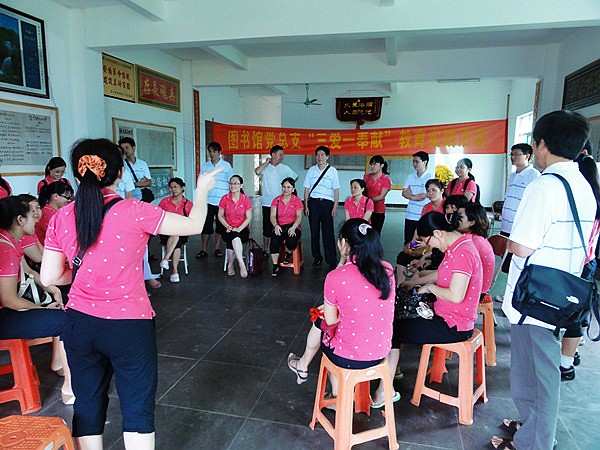 最后,在墩文文史馆里进行了党知识问答活动。主持人念出党徽图案、“三个代表”重要思想等一系列相关问题,大家围成一圈以击鼓传花有奖问答方式展开,这种新颖的学习形式很受欢迎,现场气氛热烈活跃。最后在回程的路上,大家齐唱红歌,在夕阳树影下久久回荡的《没有共产党就没有新中国》的歌声中愉快的结束了本次“三爱一奉献”教育实践活动。