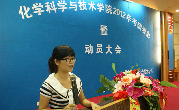 接着,08考研代表殷航上台发言。她认为考研必须具备三点:目标,心态和自信。正如没有付出,成功就不会降临,考研者只有朝目标锲而不舍地努力,不断成长,才能有所收获。随后,09考研代表黄映珊发言。她坦言,化学院是考研学子奋斗的强力后盾,领导与老师对考研人员的热切关怀让考研学子不再迷茫。“拼搏一次,成就一生”,她呼吁大家在考研路上要坚定不移地前进,创造无悔人生。