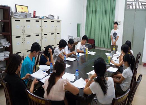 湛师新闻网6月14日讯 昨日下午,数科院2012级新生助理班主任应聘会在榕燕楼教师会议室如火如荼进行着。数科院辅导员黄展、全光华、卜秋香、杨洁老师,以及2010级各班助理班主任担任了此次招聘会的面试官。