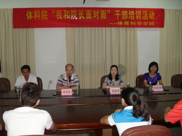 湛师新闻网6月9日讯 促进交流,扬我体育人精神。体科院今日于体育馆会议室召开了“我和院长面对面”干部培训活动。出席本次活动的有体科院院长章晓霜、辅导员钟召春、刘天明、黄鸿老师以及体科院四大机构干事。本次交流活动旨在促进该院干部之间沟通与合作。