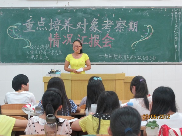 湛师新闻网5月30日讯 近三个月来,教科院教育系学生联合党支部的重点培养对象已经过了“写一篇读书笔记、做一件实事、组织一期学术沙龙、组织一期故事会,出一期黑板报或海报、策划一次党日活动”六个一等考察活动的开展及总结,支部为做好重点培养对象下一步发展工作,于5月27日晚上在燕雷楼311课室举行重点培养对象考察期情况汇报会,支部副书记陈李梅、全体培养人及重点培养对象出席了会议。