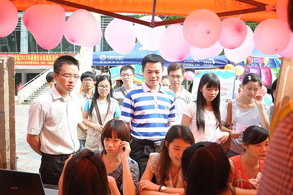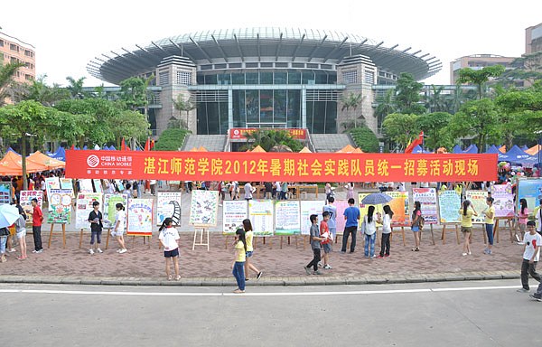 湛师新闻网5月29日讯 招贤纳士,聚焦实践七月风。5月27日,我校2012年暑假社会实践队员统一招募活动在体育馆门前举行。招募现场设置了报名区、演出区、海报墙和成果树。校团委李粤书记、李发武副书记、李亚九部长等老师亲临现场,指导招募工作,招募现场异常火爆。