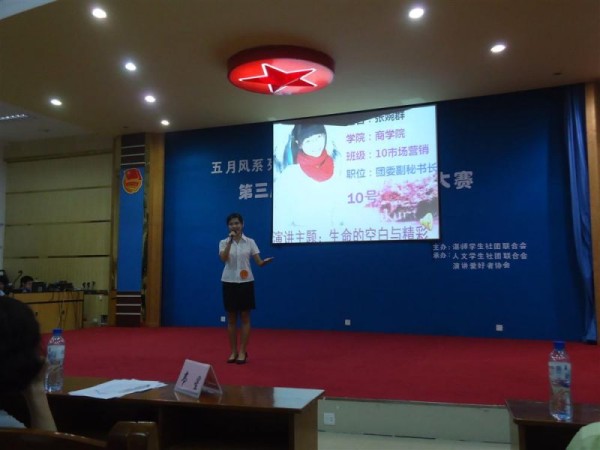经过上两轮初赛和复赛的筛选,最后剩下14支优秀参赛队伍进行本次角逐。比赛伊始,第一个环节是参赛选手的命题演讲。选手们在规定的时间内进行由主办方所命定的题目进行演讲。其中,1号选手的演讲题目《生命不留空白》对生命里的很多现象进行了深入的思考,并对同学们发出呼吁,要珍惜时间,不让生命留下遗憾。其精湛的演讲水平得到了大家的认可,赢得了现场观众们的掌声。6号的二人组合为观众带来了题为《留一份空白,绘精彩人生》的演讲,形式新颖,配合默契。他们以幽默的问答方式展开了对生命中的空白的思考,并谈到了自己对生命的色彩的看法,赢得了现场观众的喝彩。13号选手带来了题为《真爱的轨迹》的演讲,其演讲内容丰富,通过名人以及身边的故事带领着观众去领悟何为真爱,并发出了要用于追寻真爱的呼吁。其深情的演讲,生动的肢体语言和真诚的眼神交流征服了现场的评委以及观众,把现场的气氛推向了高潮。