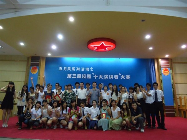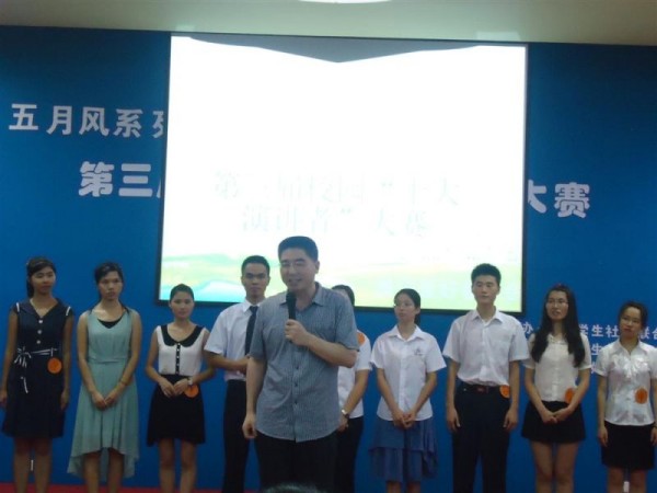 经过激烈角逐,苏小宇 、黄欢 、陈旭升、杨瑞成、何九林 、 黄玉华、张婉群 、化经纬 、陈郴霞和莫雪君(二人组合),郭巧叶十位同学荣获得了2012年度“校园十大演讲者”荣誉称号。