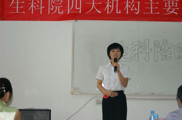 会议开始,现场播放了生科院四机构的宣传短片,从视频中大家了解到了四机构各自的基本情况。紧接着进入会议的主要环节:选手风采展示,其中包括“show出自我——一分钟自我介绍”和“才思敏捷——必答题”两个部分。选手们纷纷使尽浑身解数来为自己加分,以各种各样的表现形式来展现自己最佳的一面。候选人们的激昂演讲和答辩,赢得了观众们的欢呼和阵阵掌声,现场气氛十分活跃。在风采环节展示过后,各候选人以一句话拉票,现场观众开始投票自己心中最佳当选人。