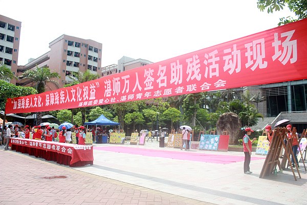 湛师新闻网5月23日讯 20日下午,以“加强残疾人文化,保障残疾人文化权益”为主题的湛师万人签名助残活动在雷阳区体育训练馆门前举行,本次活动由校团委爱心社,校青年志愿者联合会联合举办。其中人文学院开展的主题为“服务进社区,志愿暖人心”的助残风采展成为本次活动的一道靓丽风景线。