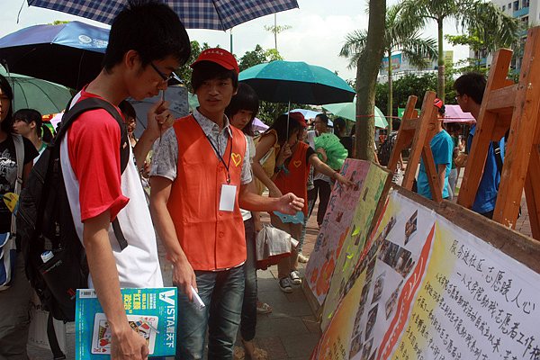 在本次湛师万人签名助残活动中,人文学院以图片展的形式向同学们展示了人文学院志愿助残小分队在助残志愿活动中的具体内容和心得体会,志愿者们在与帮扶对象的交流和帮助中,和他们结下了深厚的感情。志愿者为同学们耐心讲解了志愿帮扶活动的相关事宜和详细内容,现场气氛异常热烈。此外,由11中本2班同学表演的手语歌曲《爱》和健美操《舞动青春》也以其优美的舞姿和饱含深情的演绎博得了观众们热烈的掌声。