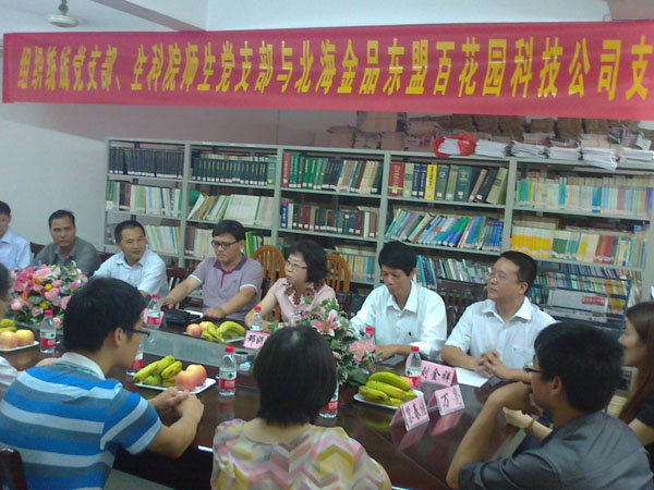 接着,施贵凌董事长向参加本次支部共建交流活动的师生党员详细介绍了北海金品东盟百花园科技开发有限公司的发展历史和经营现状。施董事长还特别地向师生党员介绍了该公司的无公害农产品生产示范基地、精品花卉生产区、百花野菜种植园、牧草种植育种中心等科技基地的生产经营状况。施董事长在讲话中表达了长期与我校进行深入合作的愿望。