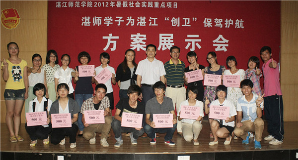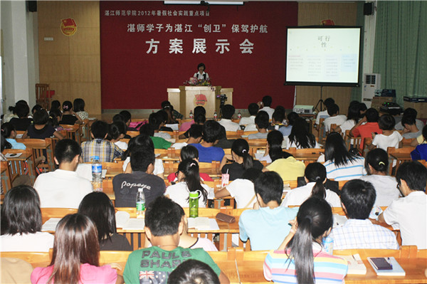 湛师新闻网5月21日讯 为积极响应湛江市政府的号召,促进“创卫”工作取得更大成效。近日,我校学子为湛江“创卫”保驾护航暑期社会实践重点项目方案展示会在我校大学生活动中心学术报告厅举行,校团委李粤书记,李发武副书记、李亚九部长以及各申报队队员参加了展示会。