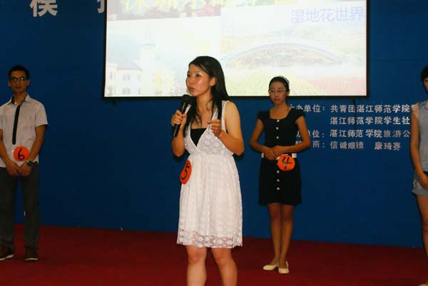 湛师新闻网5月20日讯 团旗飞扬展青春,模拟导游现风采。昨晚,由共青团湛江师范学院委员会和学生社团联合会联合主办、法政学院旅游公关协会承办的第五届模拟导游大赛总决赛在弘雷楼311室举行。湛江旅游局旅游发展促进中心全军主任、信诚眼镜总经理杨富凡先生、康琦赛经理李仕明先生、导游证考试口试考官李亚芬老师、法政学院辅导员陈明娟、陈琳琳老师以及各大社团干部代表等出席本次大赛。