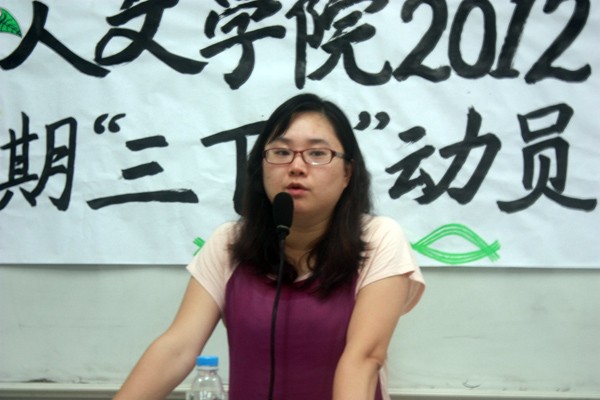 大会上,该院辅导员詹老师做了讲话。对于2011年暑期“三下乡”活动所取得的骄人成绩,她给予充分的肯定,对同学们的表现感到欣慰。她特别强调同学们注意安全问题,在“三下乡”活动中,应该凡事以安全为主,并建议同学们购买意外保险,保证个人生命安全。她也呼吁同学们开展“三下乡”活动要形式多元化,开拓创新,不必局限于支教助教,可以进行名师的追问、优秀毕业生的采访、科研和方言的调查等活动,丰富形式,创新内容。詹老师建议同学们要带目的实践,发挥主观能动性,真正触及基层生活,体验社会生活。詹老师还鼓励同学们要在艰苦的环境中激发自己的无限潜力,提高自我实践能力。