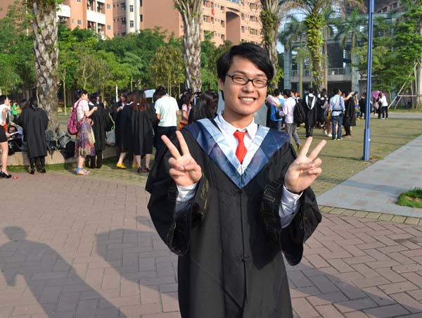 李宇鹏的生活向来比较随性子。一直以来,家人都不会在学业上给他太大的压力,只是鼓励着他追求自己想要的。他甚至在大二时转了专业要降级到09级也不曾告知家里人,直到前些天拍毕业照时被爸爸看出些端倪才全盘托出,也许是出于对儿子的宽心,家里人也没什么太大的反应。“我喜欢做自己喜欢的事情,而且自认自我控制能力还好,家人一般都很放心。”