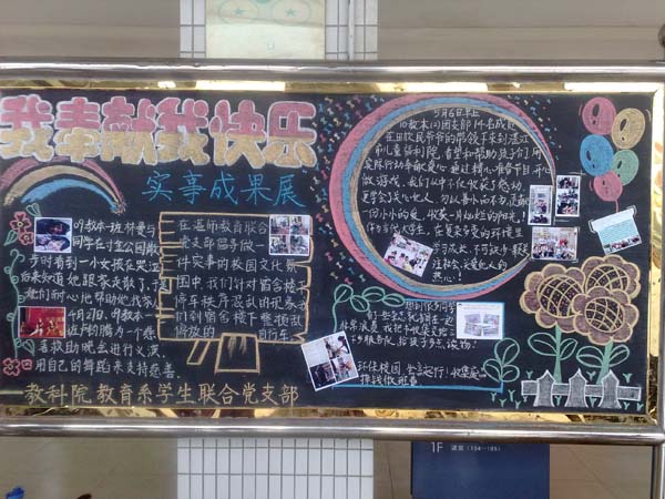 支部通过开设“湛师教科院教育系学生联合党支部”微博平台,记录着重点培养对象们在生活中做实事的点滴,他们可贵的精神和行动点缀着微博;支部成员还以黑板报的形式进行实事成果展,为“做实事”的推广提供平台。