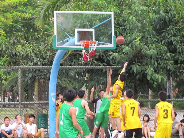 球员在场上你争我夺,一轮轮的抢球和投球动作,每次都争锋相对。各班同学都来给自己的队员加油,其他观赛的同学也为自己支持的队伍加油,此起彼伏的喝彩声和鼓掌声使紧张的赛事轻松了不少。还有由各班代表组成的拉拉队表演,各自为阵,却又配合默契,她们的表演使场上充满活力。