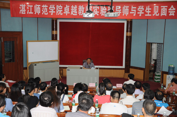 湛师新闻网5月13日讯 5月11日,我校在榕楼学术报告厅举行了卓越教师实验班导师与学生见面会。湛江市教育局李尚武副局长,我校教务处程可拉处长、教育研究院李方常务副院长、教科院王列盈书记出席了会议,校内30名老师和来自中小学一线的30名教师及全体卓越教师实验班学生参加了本次见面会。见面会由教育研究院常务副院长李方教授主持。