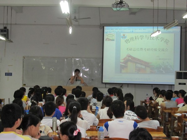 湛师新闻网5月13日讯 为进一步推动物理学院2009级学生考研积极性,提高学院的考研率,5月11日下午,物理学院在榕芳楼201室举行了2012年考研总结暨考研经验交流会,出席本次会议的有该院党委刘贵昂书记、吴万副书记、考研班主任黄桦老师、辅导员易贤老师以及五位受邀作考研经验交流的08届学生。会议由易贤老师主持。