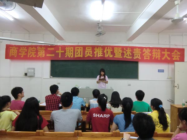 先由主持人杨焜宣读了商学院推荐优秀团员作为建党对象的规章制度和具体流程,加强团员对推优大会的思想认知及意义认识。随后,各班团支书利用PPT简单介绍了各推优对象的基本情况,他们表示此次推优名单均是本着“公平、公正”原则,通过民主投票,讨论审核等方式综合决定。而在述责答辩环节中,各答辩对象正确流利回答很好地体现了共青团员对党、团章的认知及深入了解,很好地展现当代大学生的精神风貌和模范风采。