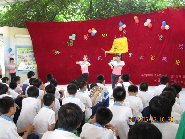 课堂教学结束后,协会的干事、会员们为湛江第一中学金沙湾学校的学生们准备了一场特别的文艺汇演。金沙湾学校的校长、我校外国语学院2011级辅导员罗成燕老师以及外教Harnson作为汇演活动出席了本次活动。
