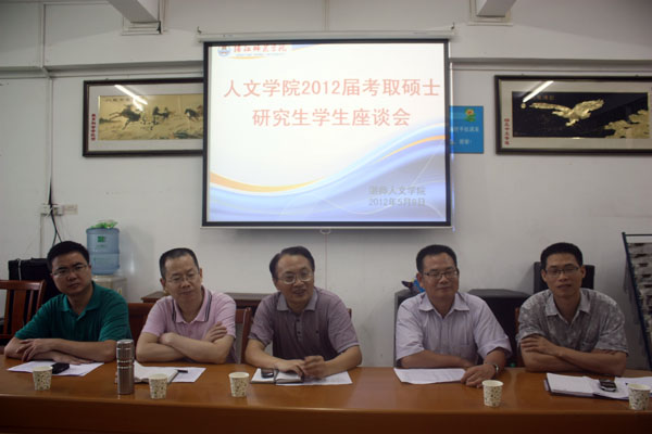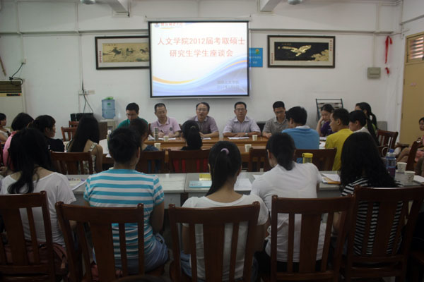 湛师新闻网5月11日讯 为了祝贺2012年考研成绩得到的重大突破,并更好地积累其中的经验,5月9日,人文学院召集成功考取研究生以及准备考研的同学在弘雷楼四楼会议室举行2012届考取硕士研究生学生座谈会,人文学院院长熊家良、党委谢应明书记、副院长王钦峰、刘惠卿、党委冯基聪副书记以及辅导员陈明辉老师、谢明亮老师出席了本次座谈会。