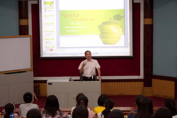 此外,邓逢光处长以自身的经历教育大学生要做到:一、端正人生观、价值观、世界观,经受住诱惑,对金钱、工作、权利有正确认识;二、扎实的专业知识十分重要,要不断提高专业技能,做一个“学高身正”的师范人;三、传承中国文化,努力提高自己的思想素质,将礼仪变成自己的一种行为习惯,做礼仪之邦的懂礼之人。