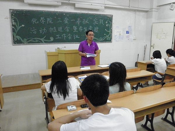 湛师新闻网5月9日讯 为进一步推进与落实学校党委关于开展“三爱一奉献”创先争优主题教育实践活动的通知精神,总结与探索学生党建工作,5月7日晚,化学院在燕雷楼313课室召开了“三爱一奉献”实践活动推进会暨学生党建工作会议。会议由化学院辅导员万国权老师主持,化学院各党支部书记及副书记参加了此次会议。