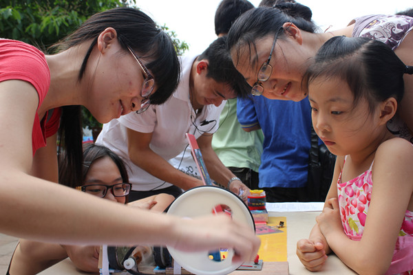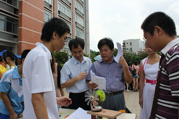 紧接着,街头物理比赛正式拉开帷幕。机器人的远程遥控,温差发电机的科学发电,简易制作的低音炮等每一件参赛作品都各具特色,新颖夺目。在表现出精密的物理原理之外,参赛选手对作品别具一格的想法也分外有趣。领导和老师们更是深入学生群中,倾听参赛者们设计的思路和想法,并对作品做出评价与建议。此间湛江航模协会精彩至极的航模表演更是将现场气氛推向高潮。