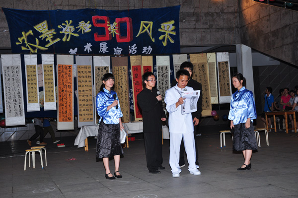湛师新闻网5月7日讯 时逢共产主义青年团建团90周年,为进一步激励团员们更好地了解和弘扬共青团光荣历史和传统,昨晚,美术学院学生社团、团委社团部在体育馆前举行“浓墨淡彩展90风采”五月风社团艺术展演活动。该院党委林志军副书记,辅导员黄钰晶老师等出席了此次活动。
