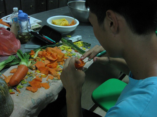 烹饪系同学在操作室里为本周日的生命科技节作最后关头的练习,争取把烹饪专业的特色更好地呈现在全校师生面前。当晚操作室十分热闹,基本上每个项目的相关同学都来到这里练习了。负责中餐热菜的大三的同学们顶着闷热在锅炉旁不断练习着各种烹调方法的菜肴,同学们的衣衫已被汗水浸湿,但他们并没有放下手中的工具。负责雕刻的同学们手拿各类雕刻刀全神贯注地刻着手中的胡萝卜、南瓜,旁边再吵也没有对他们造成任何影响。在面点房那边,大二的同学们一遍又一遍地搓弄着手中的澄面,捏出各种各样的造型来……示范包捏、冷拼造型、面点成品制作的同学也在努力着。在科技节当天,烹饪专业需要展示的有很多,很大部分都属于技术活方面的,如蛋糕裱花、西餐菜点、水果围边等,所以负责这部分的同学们只有利用好课余时间来练习。因为热爱这个专业,才不断练习着,力求把最好的展现出来,所以再苦再累烹饪学子们也没有抱怨。