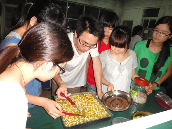 此次工作准备重点在加工区的作品,包括酸奶、碳酸饮料、糯米酒、泡菜和果冻五个项目。其中酸奶、糯米酒和泡菜的成品已经制作完成,而泡菜的制作地点选择在宿舍,现场制作的是碳酸饮料和果冻。碳酸饮料的制作较其他项目简单,但是同学们没有半点松懈,经过多次的预实验才迎来今天的正式制作。同学们制作的饮料与市面上买到的大有不同,不带有任何的添加剂,味道也新鲜可口。果冻组的同学更是忙得不亦乐乎。果冻的制作要考虑的因素很多,比如温度的高低,鱼胶粉与水、果汁的比例等。果冻的类型有雪梨、火龙果和凤梨等,各式各样,风味十足。在不断的摸索中,同学们的技术越来越娴熟,从材料的准备、搅拌、熬煮到冷却每一个步骤都很认真,整个过程完成得很好。负责讲解相关作品的同学也在一旁练习解说词,力求精简好,让参与当天活动的同学们在品尝到美味的食品同时也学会自己制作。